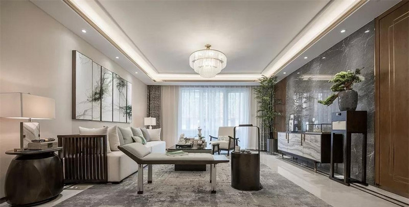 新中式风格中的现代元素,弱化了古典中式的浓郁感,呈现出更符合当下生活的一种空间状态;在本案中,设计师以灰色作为空间主调,利用灰色所展现出的平和雅致,将中式格调中的内敛低调相契合,使现代感的新中式空间被营造的既有着复古底蕴又不乏时尚轻奢质感。